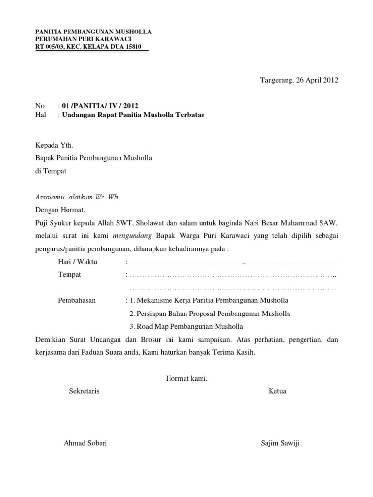 UNDANGAN RAPAT PEMILIHAN PENGURUS TAKMIR MUSHOLLA AL-ABROR PERIODE 2012-2015 MUSHOLLA AL-ABROR TAHUN 1433 H. Contoh surat undangan rapat musholla. Contoh surat undangan rapat pertemuan 2018 kumpulan contoh.