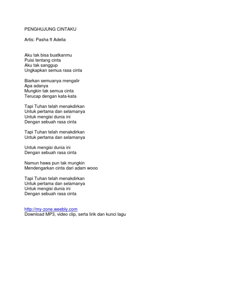 Lirik Lagu Penghujung Cintaku Feat Adelia - Pasha Ungu Berakhir sudah pencarian cintaku Jiwa ini tak lagi sepi hati ini tlah ada yang miliki Tiba diriku di penghujung mencari cinta Diri ini tak lagi sepi kini aku tak sendiri Aku akan menikahimu aku akan menjagamu Ku kan selalu di sisimu seumur hidupmu. HttpbitlyTOPYTsubsAjakin orang yang ngalamin cerita kayak lagu ini. Lirik lagu ungu penhujung cintaku.