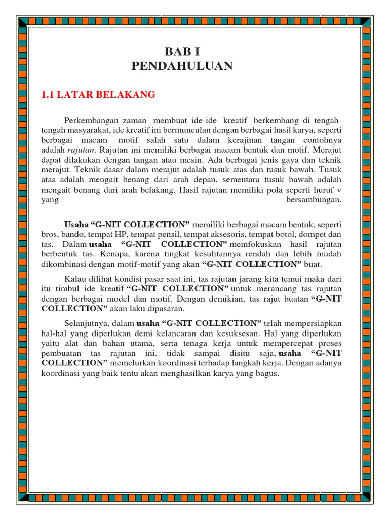 Contoh Proposal Usaha Kerajinan Tas Rajut. Rajutan Sederhana meliputi syal sederhana ribbing syal 4 x 2 sepatu bayi topi telinga kancing tas dan lain-lain. Detail Proposal Usaha Dompet PDF dapat kamu nikmati dengan cara klik link download dibawah dengan mudah tanpa iklan yang mengganggu.