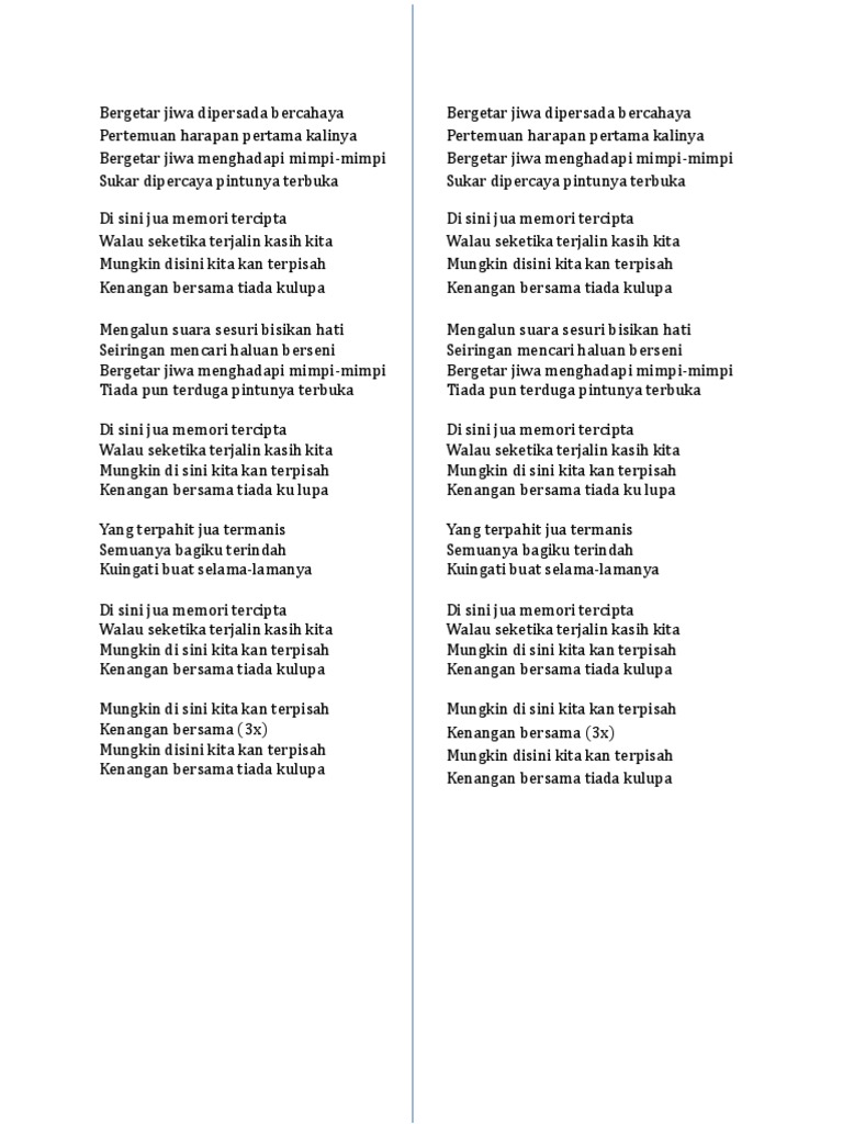 Am F Gm Bergetar jiwa dipersada bercahaya F Bb F Pertemuan harapan pertama kalinya Am F Gm Bergetar jiwa menghadapi mimpi-mimpi A Dm C Sukar dipercaya pintunya terbuka F Gm Di sini jua memori tercipta C F Walau seketika terjalin kasih kita Gm F Bb Mungkin disini kita kan terpisah C F Kenangan bersama tiada kulupa F Gm Mengalun suara sesuri bisikan hati Bb F Seiringan mencari.