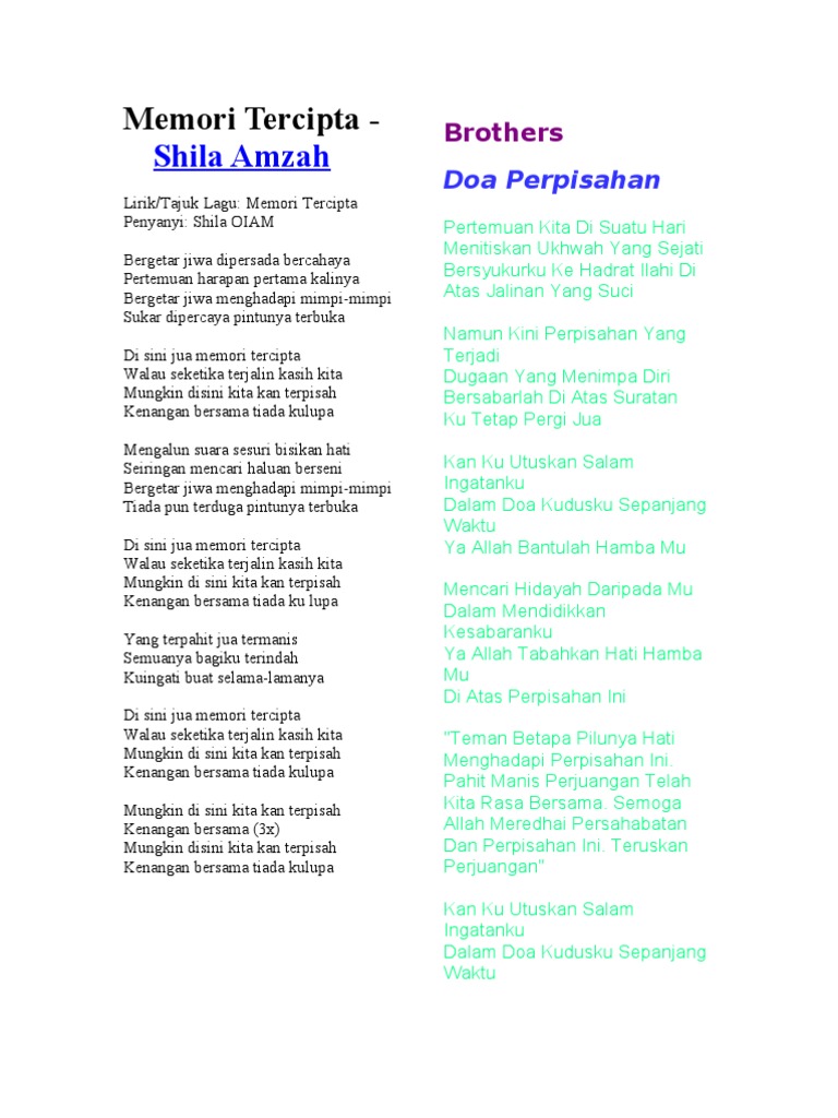 Bergetar jiwa menghadapi mimpi-mimpi. Shila - Memori Tercipta Shila OIAM - Memori Tercipta Lirik-Bergetar jiwa dipersada bercahaya Pertemuan harapan pertama kalinya Bergetar jiwa menghadapi mimpi-mimpi Sukar dipercaya pintunya terbuka Di sini jua memori tercipta Walau seketika terjalin kasih kita Mungkin disini kita kan terpisah. Lirik Lagu Memori Tercipta Shila Amzah.